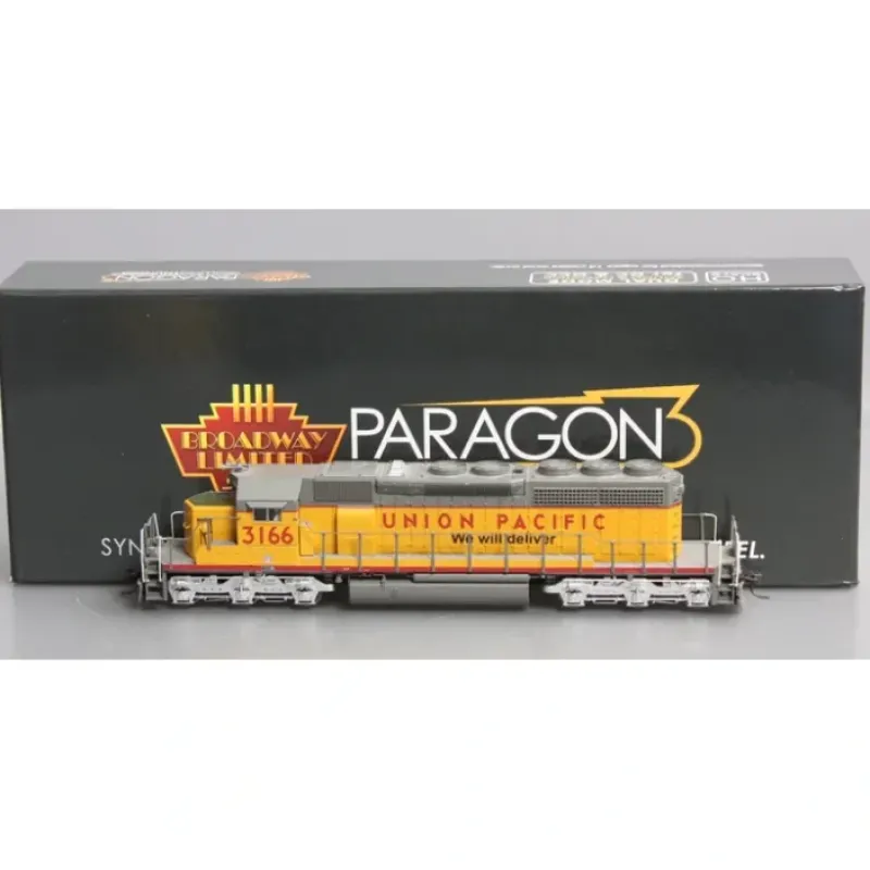 This is a Broadway Limited 4224 HO Scale Union Pacific EMD SD40-2 Low-Nose with Sound& DCC – Paragon3 #3166 (Armour Yellow, gray). Features: New Paragon3 Sound & Operation System Featuring Rolling Thunder with Authentic Sounds and Prototypical Operation in both DC and DCC environments, Factory InstAlled Engineer / Fireman Figures, Locomotive Composition: ABS Body with Die Cast Chassis, Couplers: (2) Operating Kadee or Compatible, Compatible Tracks: Code 70, 83, 100 Rail, Equipped with Traction Tires, Minimum Operating Radius: 18 in or greater.