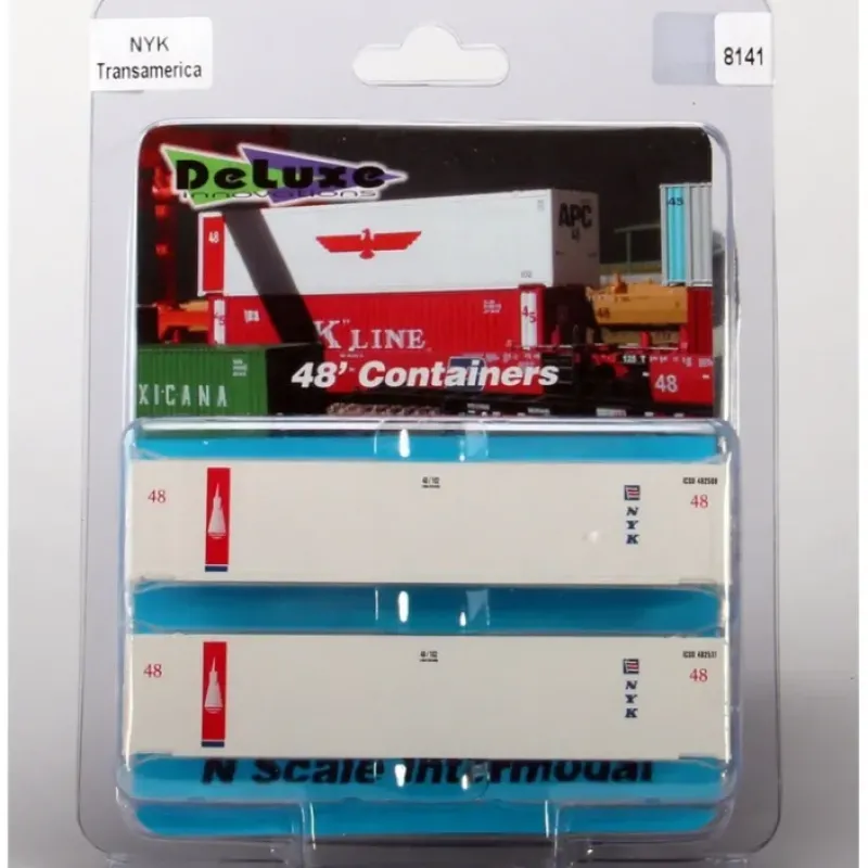 This is a Deluxe Innovations 238-8141 N Scale 48′ Smoothside Container 2-Pack NYK/TransAmerica Model is based on the Monon sheet and post container with interior bracing and a smooth exterior. Features include the distinctive sawtooth front and angled corner post casting. Two different roadnumbers per pack. CN Laser Burlington Northern America NYK/TransAmerica