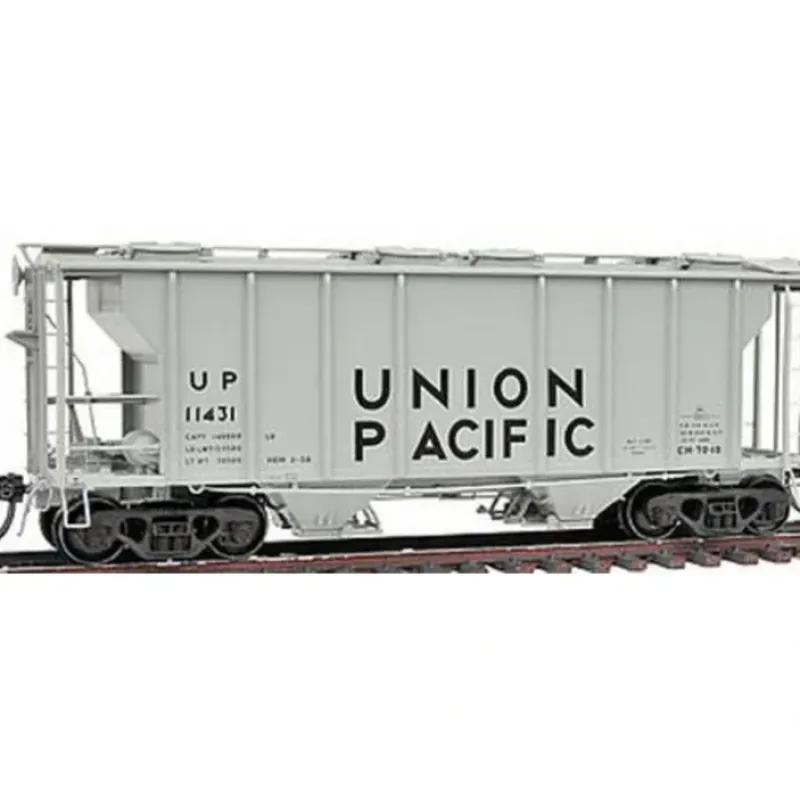 This is a Kadee 8034 HO Scale PS-2 Two-Bay Covered Hopper – Ready to Run Union Pacific #11431 (1955 Scheme gray, black Lettering). This car features plastic construction, plastic trucks, metal wheels and axles, and knuckle couplers.