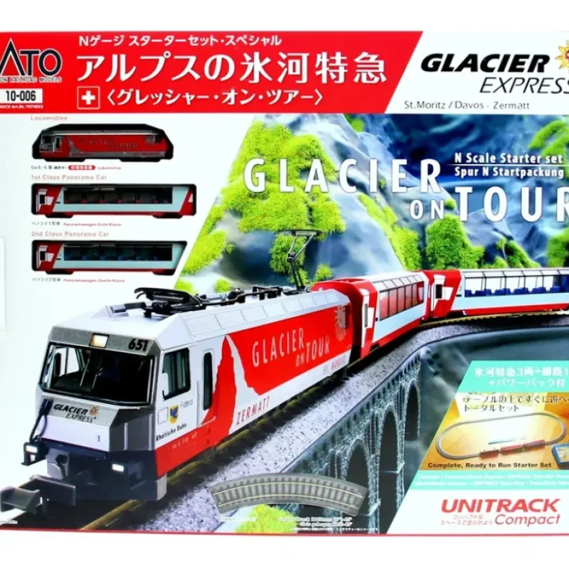 This is Kato 10-006 N Glacier Express Set. Swiss Alpine Glacier Express passenger train starter set with Power Pack and track.