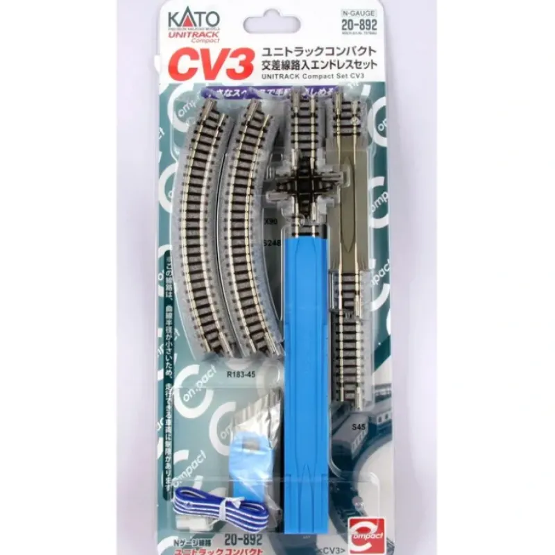 This is a Kato 20-892 N Scale CV-3 Unitrack Compact Set with Crossing. The Kato UniTrack Master (M) and Variation (V) sets are the ultimate expansion track sets, perfect for beginners who are looking to get started in the hobby, while also providing complex structures for those seeking to create more complex and advanced layouts! Starting with the base Master Set, you can expand to create any layout you desire by adding as many Variation sets or individual UniTrack pieces as you like! Each Variation set box contains a complete layout landmark, whether it’s a staging yard, a passing siding, or a flyover viaduct bridge CV-3 UniTrack compact set with crossing. Semi-circle of track with 7 cuves, 248mm (9 3/4) straight pieces, a grade crossing and a 90 degree crossing. Also includes a rerailer and feeder track.