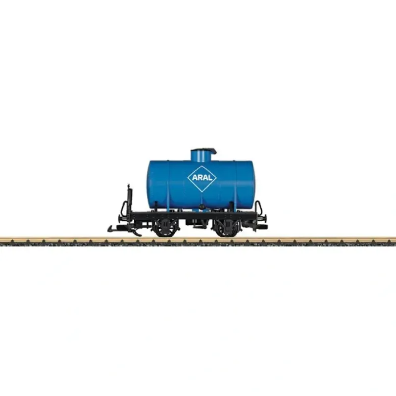 This is LGB 94580 Toy-Train Aral Tank Car. 4-Wheel Tank Car – Ready to Run — Aral (blue)