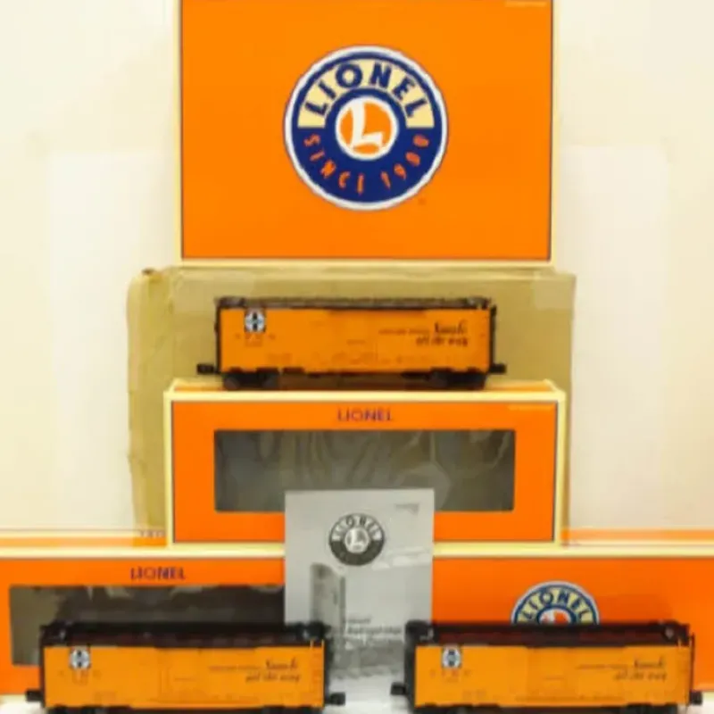 Here is a Lionel 11896 Santa Fe Steel Sided Reefer Set. The cars are scale length. Features include Die-cast metal sprung trucks for improved tracking, especially through switches, Operating couplers uncouple cars automatically with a remote-control or uncoupling track section, Scale proportions, Super-detailed with many separately applied metal parts, Prototypical paint schemes, Perfectly sized to match Lionel Standard O Locomotives, Hidden uncoupling tabs, Separately applied metal underframe details, Opening roof hatches with props, Opening doors, Single and 3-Pack reefers available in unique, sequential numbers, Gauge: Standard O, Minimum Curve: O-31, Dimensions: Length: Single car 11 1/2 inches, RailLine: Santa Fe.