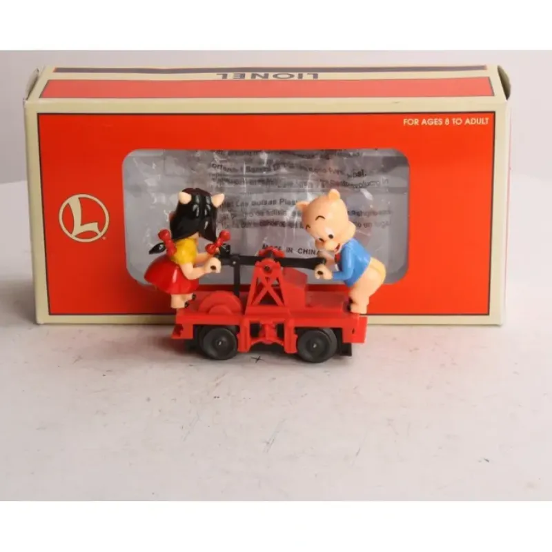 Here is a Lionel 6-18434 O Gauge Porky and Petunia Handcar from 1996. It is self-propelled. As is moves down the track Porky and Petunia move the handcar pump handle up and down.
