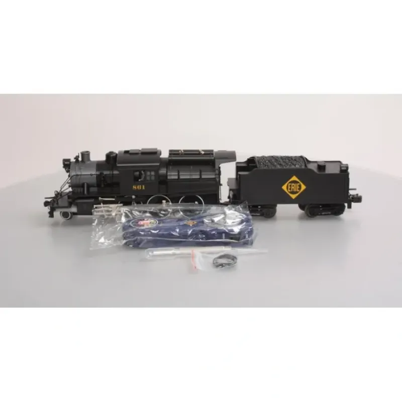 This is a Lionel 6-82418 O Erie LionChief Plus Camelback Steam Locomotive #861. Features: User selected operational modes: Conventional AC transformer control mode or LionChief wireless remote control with AC or DC power, ElectroCoupler on rear of tender controlled by the LionChief remote only, Operating headlight, Synchronized fan-driven smoke, On/off switches for sound and smoke, RailSounds RC sound system with steam chuffing and background sounds, whistle, bell, and user-activated announcements, Adjustable volume (controlled by remote only), Constant speed control to maintain a steady speed at a crawl or full speed and everything in between regardless of track conditions or load, Flickering firebox, Chuffing sounds in sync with speed of locomotive, Powerful maintenance-free motor, Die-cast metal locomotive body, frame, and trucks, Die-cast metal tender body and trucks, Metal frame on tender, Engineer and fireman figures, Traction tires.
