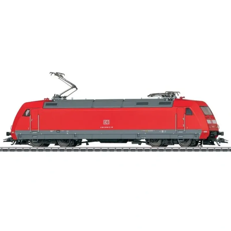 This is a Marklin, Inc 37370 HO Scale Class 101 Electric – 3-Rail with Sound & Digital German Railroad DB AG (Era VI 2010s, red, gray). Features mfx digital decoder, metal frame and body, controlled high-efficiency propulsion, 2 axles powered, traction tires and LED directional lights. The trucks have movable reproductions of the mechanical gear for steering. Features mfx digital decoder with sound functions, two axles powered, traction tires and triple directional headlights.