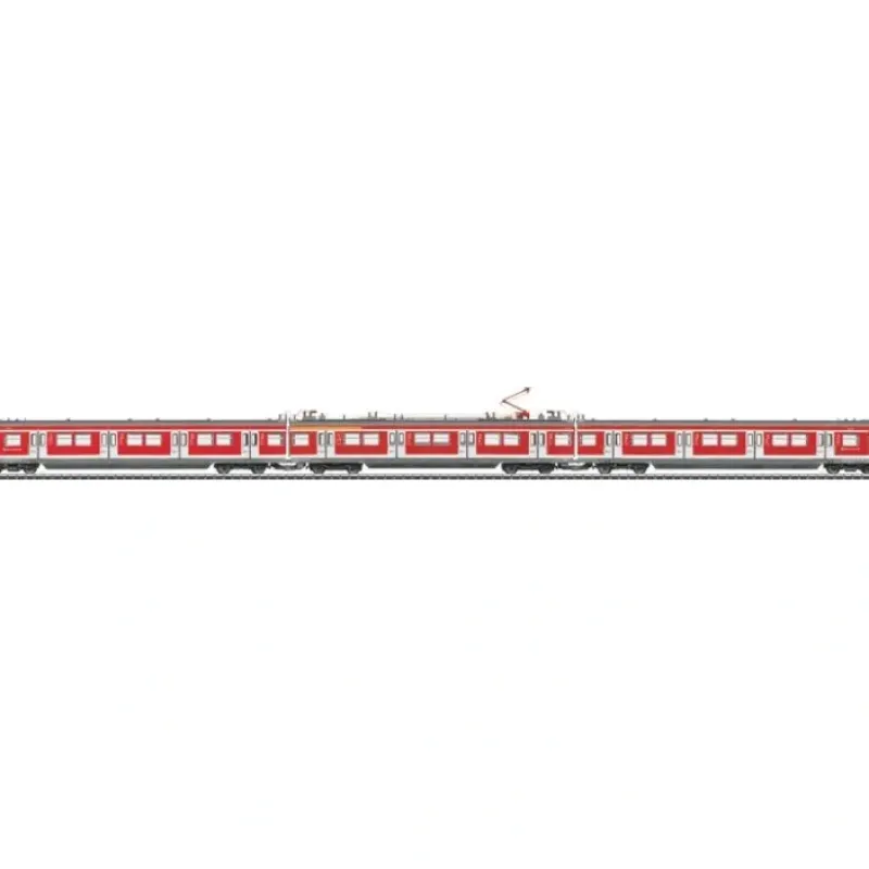 This is a Marklin, Inc 37506 HO Scale S-Bahn Electric Railcar Train – 3-Rail with Sound & Digital German Railroad DB AG (Era VI, Traffic Red, white, gray). The train has an mfx digital decoder and extensive sound functions. It also has controlled high-efficiency propulsion. Four axles on the intermediate car are powered through cardan shafts. The frame for the intermediate car is constructed of die-cast metal. The lighting is done with warm white LEDs, and it will work in conventional operation. The train has triple headlights and dual red marker lights that change over with the direction of travel. The end cars have a pickup shoe changeover feature so that the pickup shoe at the front of the train is the one picking up power. Lighted destination signs along with the headlights / marker lights can be controlled digitally. There is a close coupler guide mechanism and electrical connections between the cars. The special coupling included with the train allows it to be coupled to other ET 420 units for prototypical operation. The train has factory-installed interior lighting. The bodies for the train are made of highly detailed plastic with many separately applied details such as grab irons, electrical connections, windshield wipers, antennas, whistles, and horns. The train has a multi-color interior. The ends of the train have a detailed representation of the Scharfenberg coupler (a dummy coupler). Different authentic destination signage is included with the train. Length over the couplers 77.5 cm / 30-1/2. Highlights: Highly detailed scale construction. Prototypical interior details. Maintenance-free warm white LEDs for the lighting. 5-pole skewed armature motor with a flywheel for silky smooth running characteristics. Pickup shoe changeover feature.