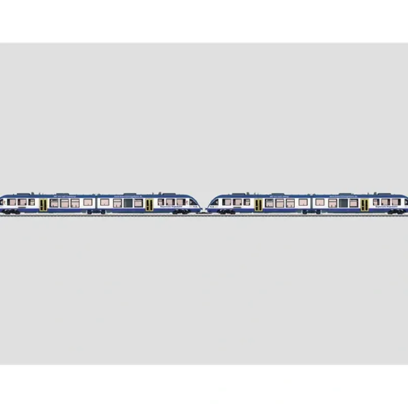 This is a Marklin, Inc 37733 HO Scale LINT 41 Class 648.2 Diesel Railcar Set – 3-Rail – Digital & Sound Equipped 1 Each Powered & Unpowered Bavarian Regional Railroad Regiobahn (Era VI blue). The train has a powered unit and a non-powered dummy unit. The train has an mfx digital decoder and extensive sound functions. It also has controlled high efficiency propulsion. The train has a powerful motor with a bell-shaped armature and a flywheel, mounted in the Jakobs truck. 2 axles powered. Traction tires. The train has factory-installed interior lighting. The headlights and the interior lighting are maintenance-free warm white LEDs. The headlights and marker lights change with the direction of travel on both units. The train destination sign has prototypical yellow LEDs. The headlights, train destination sign, and dual red marker lights will work in conventional operation and can be controlled digitally. The frame and bodies have detailed construction and there is a free view through the windows. The train has interior details, closed diaphragm connections, and a guide mechanism on the Jakobs truck between the rail car halves. There is a 5-conductor coupling to connect the rail cars. Total length approximately 96.4 cm / 38. Highlights: Prototypical double train set. Factory-installed interior lighting included. mfx decoder with a sound generator. Lighted train destination signs.