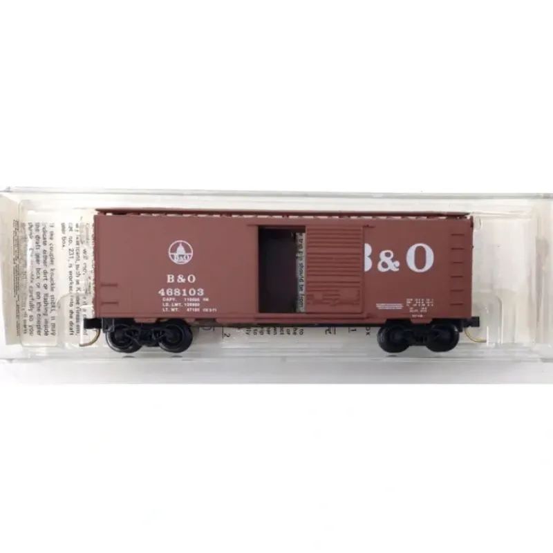 Here is a Micro-Trains 20312 N Scale B&O Box Car #468103. It features plastic construction, knuckle couplers, plastic wheels and axles.