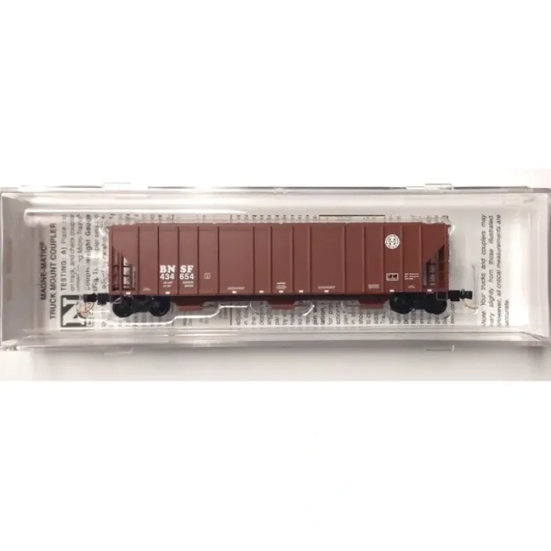 This is a Micro-Trains 09900140 N BNSF Evans 100-Ton 3-Bay Covered Hopper #434654. It runs on Barber roller bearing trucks. Built in September 1971 as part of a combined order from the Burlington Northern Railroad and CB&Q subsidiary Colorado & Southern Railway, this car represents the sole merger-acquired high-capacity grain hoppers representing Gunderson. Cars in these series were assigned different car number series by BNSF due to the slightly different load volume capacities. Its key features are: Elongated hatches Painted brown and bears the white BNSF logo and white lettering This car features plastic construction, plastic trucks, wheels and axles, and knuckle couplers.