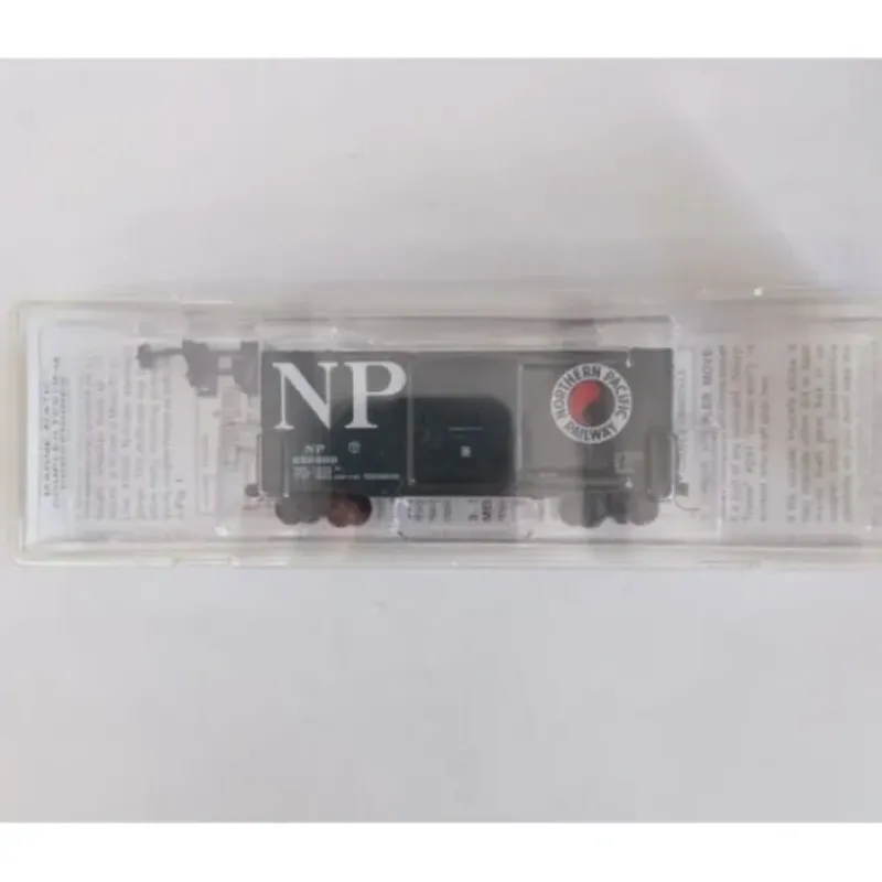 This is Micro-Trains 10100010 N NP 40” Single Door Hi-Cube Boxcar #659995. This 40′ high-cube box car is painted dark green with the white, black and red Northern Pacific Monad herald. Lettering is in white. It was built in November 1967 and runs on roller bearing trucks. The high-cube box cars were used primarily for appliance traffic.