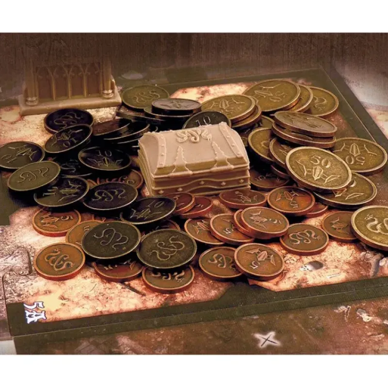 This set includes 58 high-quality metal coins – finely minted in zinc alloy and with an antique finish – in three different designs and denominations: 5 Crowns (25 coins), 10 Crowns (18 coins), 50 Crowns (15 coins). Use them to upgrade your Sword & Sorcery set, or as accessories in any other fantasy adventure game.