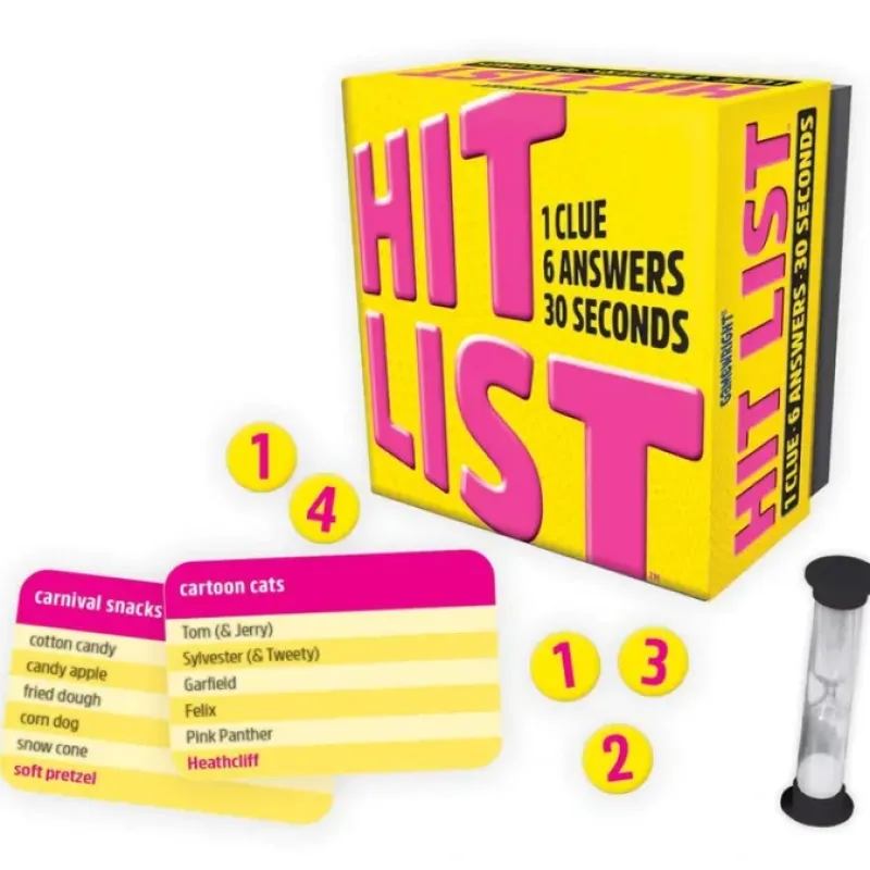Put this hit party game at the top of your list! Flip the timer, draw a card, and race to shout out answers that fit the category. How quickly can your team name ice cream brands? Vampires? Cartoon cats? Answers can be obvious or obscure, but they score only if they’re on the Hit List!