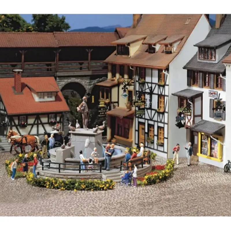 This is Faller 130232 Ornamental water fountain. An attractive centre of interest for a village square or a town circus. The fountain can operate with water pumped through by pump 180627 when placing a water tank below the fountain. When no water is used the bottom should be covered with lake plastic sheet 170191 for realistic decoration. Cross-sectional view: ornamental fountain 130232 with built-in water pump 180627. This building kit contains: 48 single parts in 7 colours and 1 construction instruction.