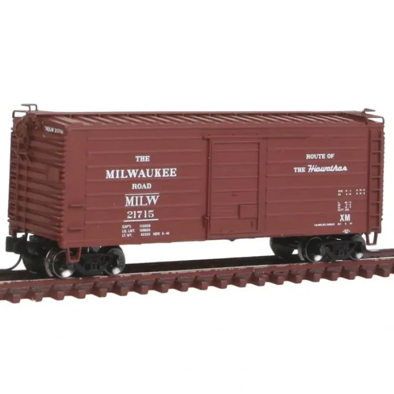 This is a Fox Valley Models 282-90223 N Scale Short-Rib 40′ Rib-Side Boxcar – Ready to Run Milwaukee Road #21715 (Boxcar Red, Hiawathas Slogan). This car features a durable plastic construction, metal wheels, plastic axles, plastic trucks & knuckle couplers.