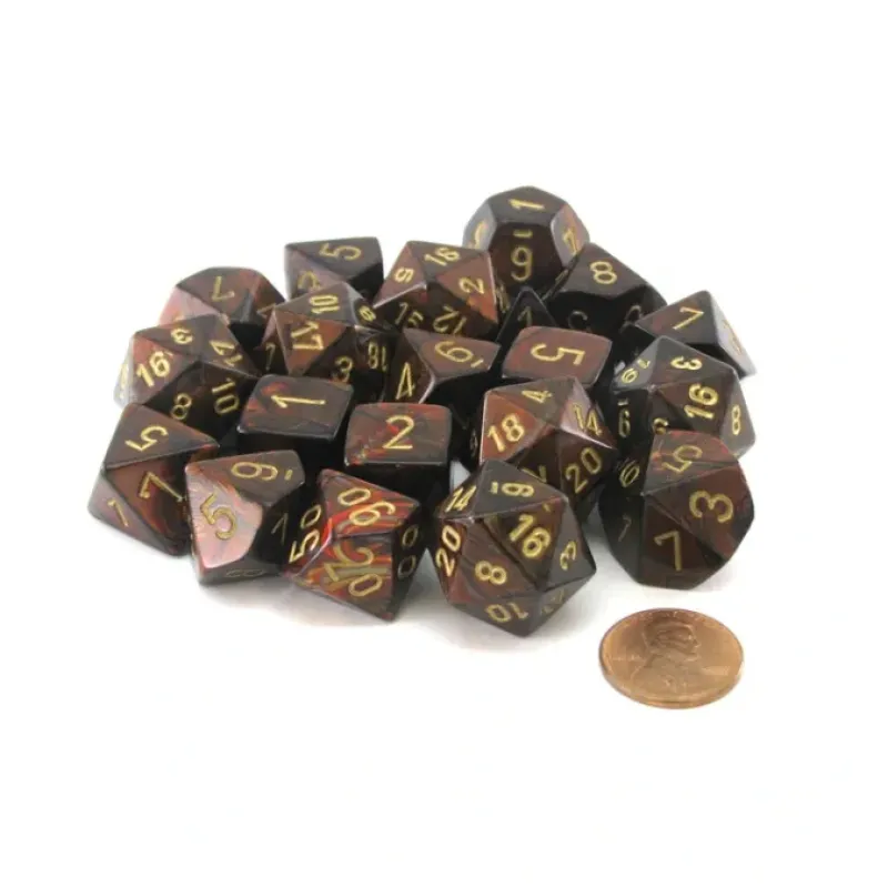 This bag of 20 dice contains one D4, three D6 with numbers, one D8, seven D10, one Tens D10, one D12, and six D20 dice.