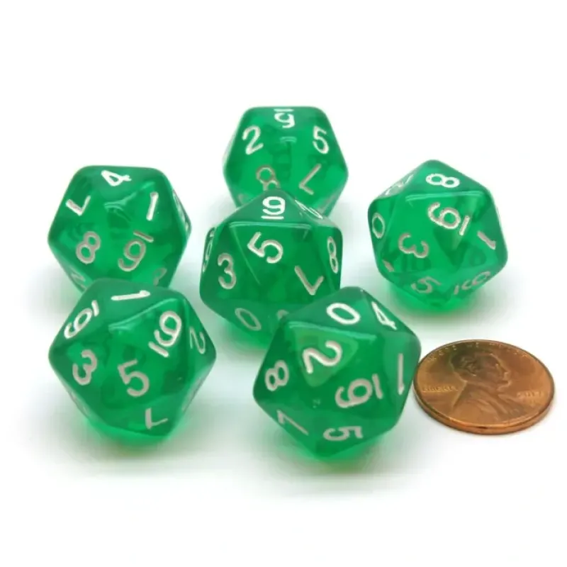 These twenty sided 20mm Translucent, Numbered Twice dice are numbered from 0 to 9 two times, and feel great in your hands. These dice are unique, good quality, and great for any dice game! The 6 and 9 have lines under them to help differentiate the two numbers.