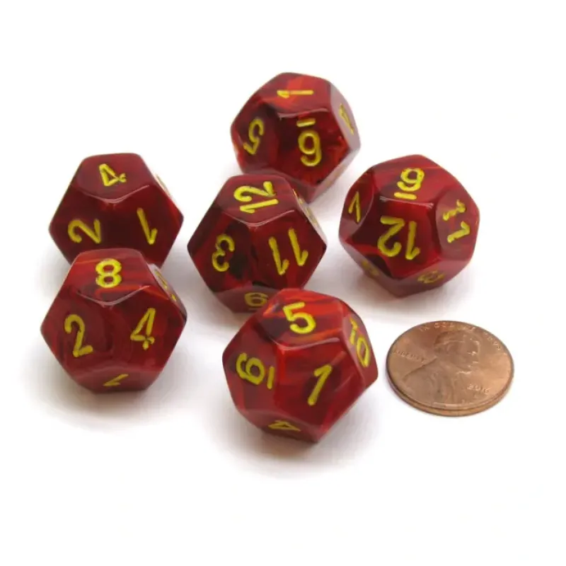 These twelve sided 18.5mm Vortex dice are numbered from one to twelve with numbers, not pips, and feel great in your hands. These dice are unique, good quality, and great for any dice game! The 6 and 9 have lines under them to help differentiate the two numbers.