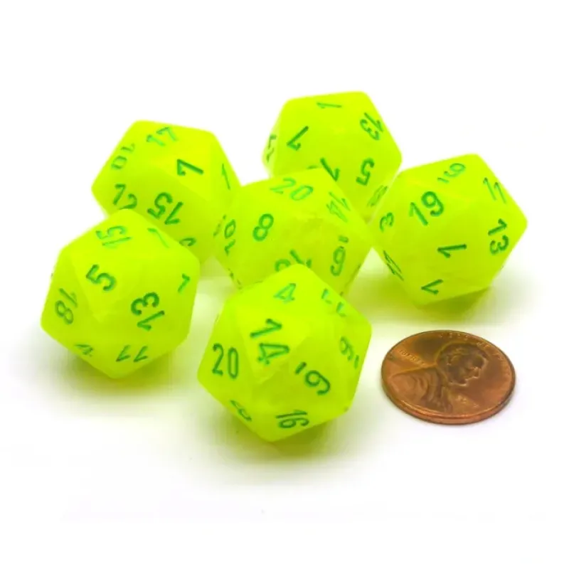 These twenty sided 20mm Vortex dice are numbered from 1 to 20 with numbers, not pips, and feel great in your hands. These dice are unique, good quality, and great for any dice game! The 6 and 9 have lines under them to help differentiate the two numbers.