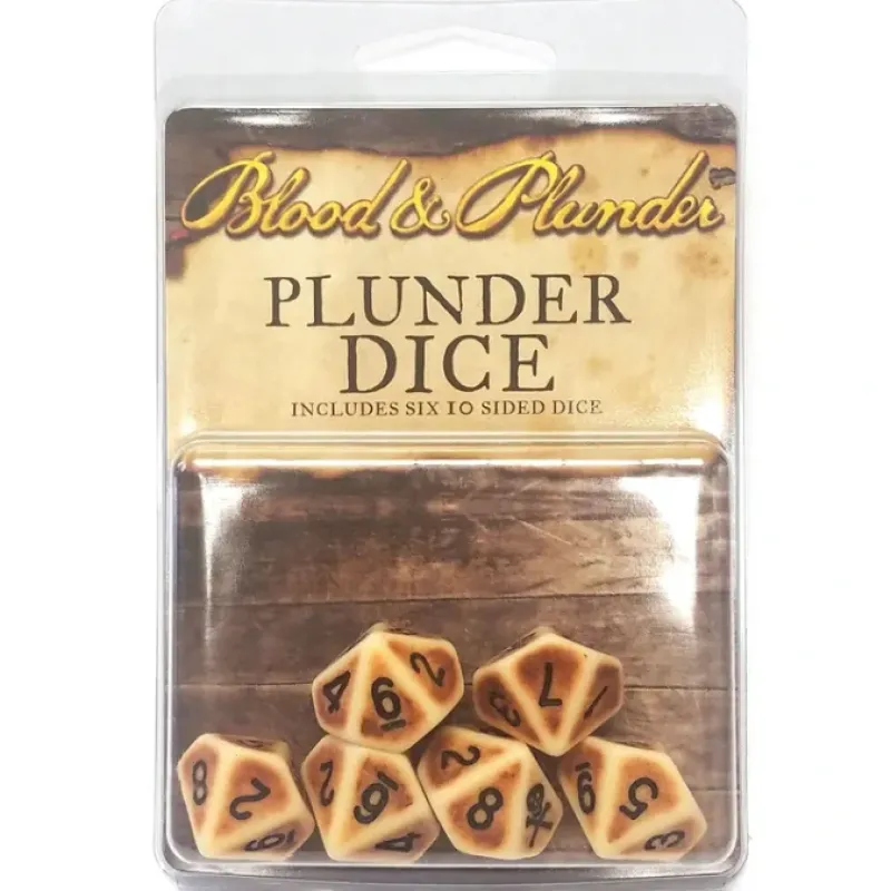 Blood & Plunder uses 10-sided dice to determine the outcome of many situations in the game. A handful (usually 412) are required to play. This is a set of 6 bone white dice. Each die is marked 0 to 9, with the Skull and Crossbones symbol representing the 0 side.