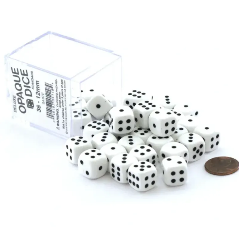 These 36 deluxe opaque dice are numbered from one to six with traditional dice pips etched into the sides and painted black. At 12mm tall the dice are quite a bit smaller than what are considered standard sized dice (16mm). The dice feature smooth round edges, and a high quality look and feel. Great for any dice game. Includes 36 dice in a clear plastic display case.
