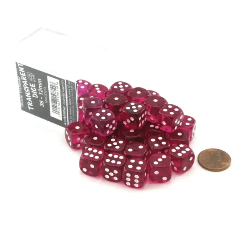 These 36 deluxe transparent dice are numbered from one to six with traditional dice pips etched into the sides and painted white. At 12mm tall the dice are quite a bit smaller than what are considered standard sized dice (16mm). The dice feature smooth round edges, and a high quality look and feel. Great for any dice game. Includes 36 dice in a clear plastic display case.