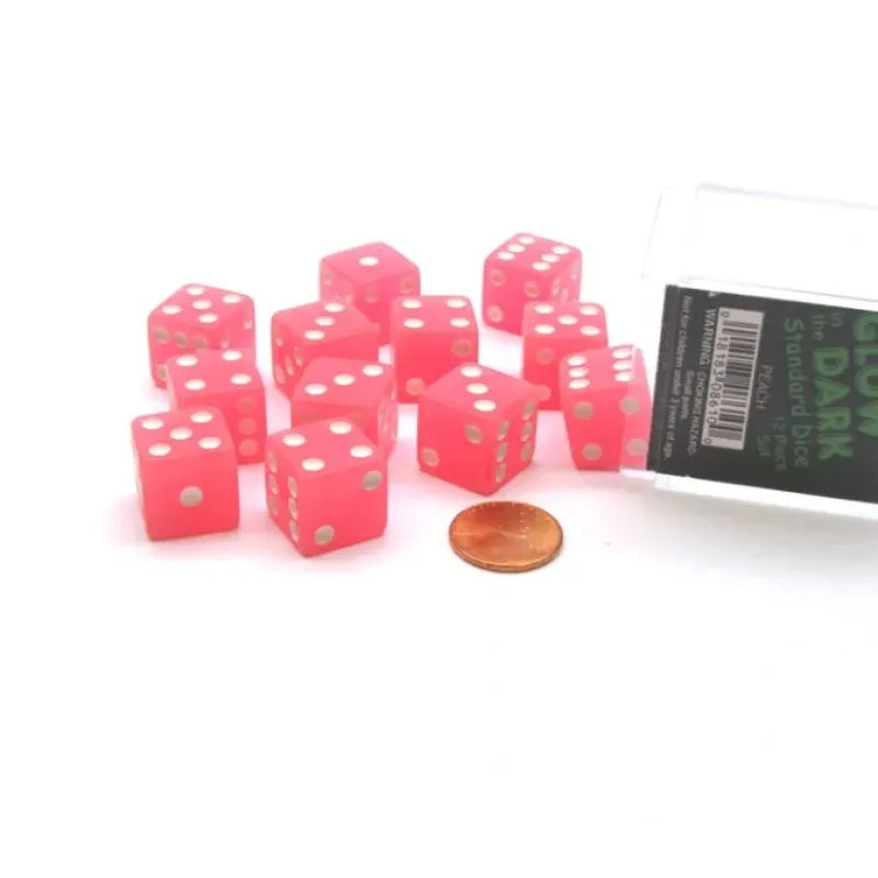 Dice>Case with 12 16mm Glow in the Dark Dice – Peach Color with White Pips – Your Source for Gaming Essentials