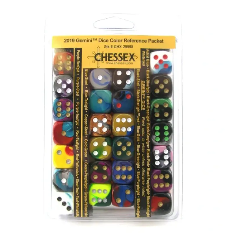 Interested in adding unique dice and variety to your collection? Then this pack is for you! This “Gemini” Dice Color Reference Packet by Chessex is perfect for anyone looking to see what style dice are available by Chessex. This pack includes 26 different “Gemini” dice! Dice may be numbered or spotted – assortment varies but most dice are typically spotted.
