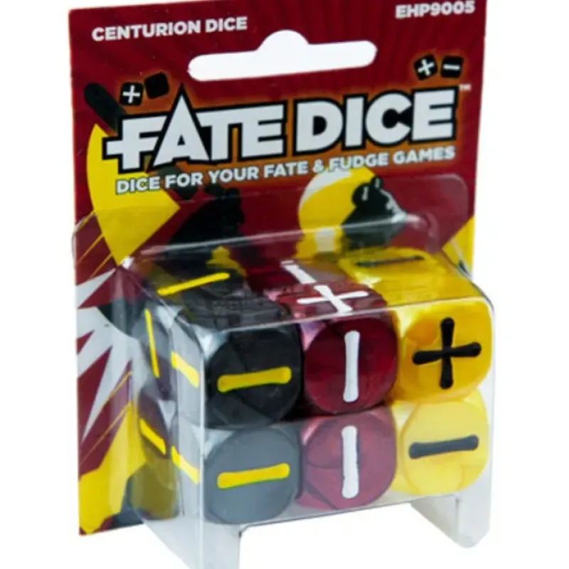 Add color and excitement to your Fate and Fudge games with Fate Dice! Each package contains three sets of four 16mm fudge dice (12 dice total). The symbols are large and wide with rounded, flared ends and a gentle curve expressed throughout the stroke, so theyre easier to read. The Twelve pearlized Fate Dice in three high contrast, high flying styles, inspired by Spirit of the Century: 4 pearlized black Fate Dice with yellow ink, 4 pearlized burgundy Fate Dice with white ink, and 4 pearlized golden yellow Fate Dice with black ink.