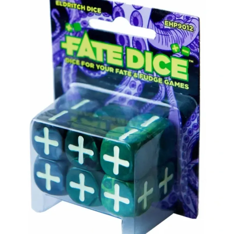 Add color and excitement to your Fate and Fudge games with Fate Dice! Each package contains three sets of four 16mm fudge dice (12 dice total). The symbols are large and wide with rounded, flared ends and a gentle curve expressed throughout the stroke, so theyre easier to read. Invoke your dark magic with twelve Fate Dice in three spectacular tentacular styles: 4 dark green Fate Dice with glow in the dark ink, 4 shadowy grey Fate Dice with glow in the dark ink, and 4 yellow-green Fate Dice with glow in the dark ink.