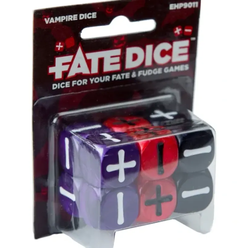 Add color and excitement to your Fate and Fudge games with Fate Dice! Each package contains three sets of four 16mm fudge dice (12 dice total). The symbols are large and wide with rounded, flared ends and a gentle curve expressed throughout the stroke, so theyre easier to read. The 12 pearlized Fate Dice come in three lurid colors, for the discerning undead gamer: 4 pearlized black-purple Fate Dice with white ink, 4 pearlized red Fate Dice with black ink, and 4 pearlized royal purple Fate Dice with white ink.