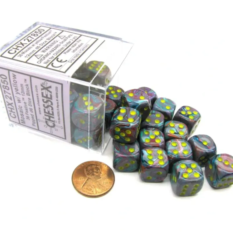 These Chessex 12mm round-cornered dice have a great look, feel, and roll. They are numbered 1 to 6 with traditional dice pips, spots, etched into the surface of the dice. Use these dice to play your favorite dice and board games or create your own game. 36 dice and 1 plastic display case included with purchase.