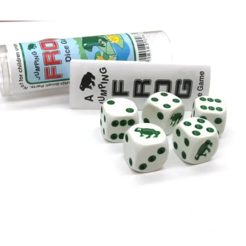Enjoy playing the Frog dice game at home or on the go! All contents of the game are included inside a conveniently sized plastic tube. See gallery images for a copy of game play and rules.