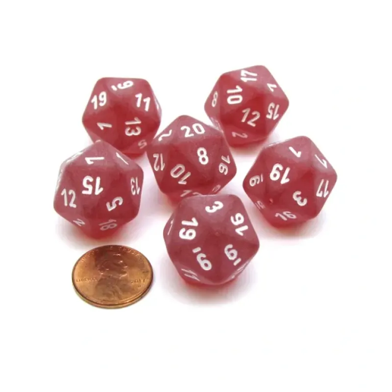 These twenty sided 20mm Frosted dice are numbered from one to twenty with numbers, not pips, and feel great in your hands. These dice are unique, good quality, and great for any dice game! The 6 and 9 have lines under them to help differentiate the two numbers.