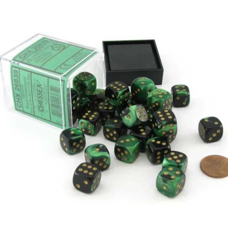 Dice>Gemini 12mm D6 Chessex Dice Block (36 Dice) - Black-Green with Gold Pips - Your Source for Gaming Essentials