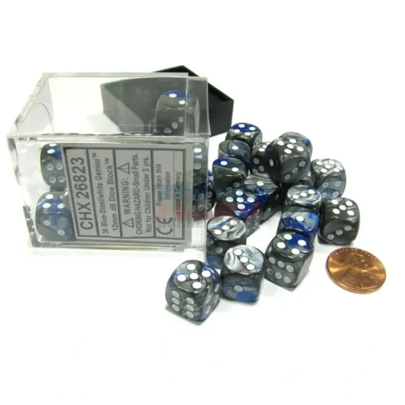 Dice>Gemini 12mm D6 Chessex Dice Block (36 Dice) – Blue-Steel with White Pips – Your Source for Gaming Essentials