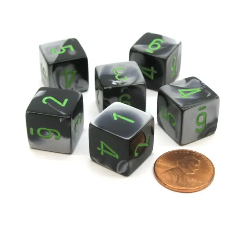 Dice>Gemini 15mm 6-Sided D6 Numbered Chessex Dice, 6 Pieces - Black-Grey with Green - Your Source for Gaming Essentials