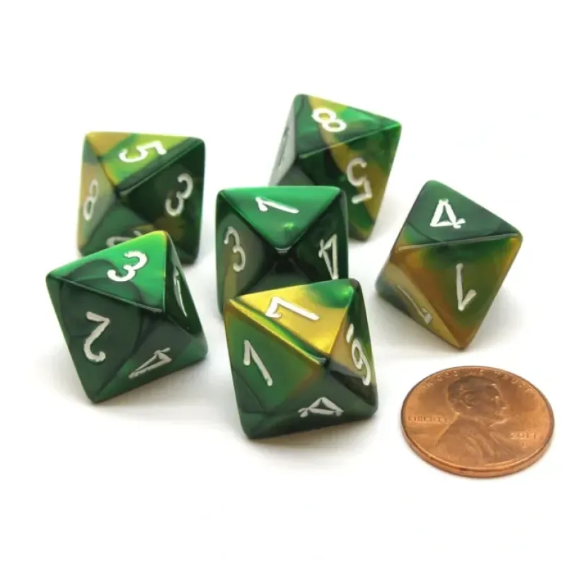 These 8-sided 15mm Gemini dice are numbered from one to eight with numbers, not pips, and feel great in your hands. These dice are unique, good quality, and great for any dice game! Numbers are centered on each side and the 6 is underlined.