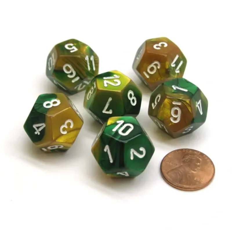 These twelve sided 18.5mm Gemini dice are numbered from one to twelve with numbers, not pips, and feel great in your hands. These dice are unique, good quality, and great for any dice game! The 6 and 9 have lines under them to help differentiate the two numbers.