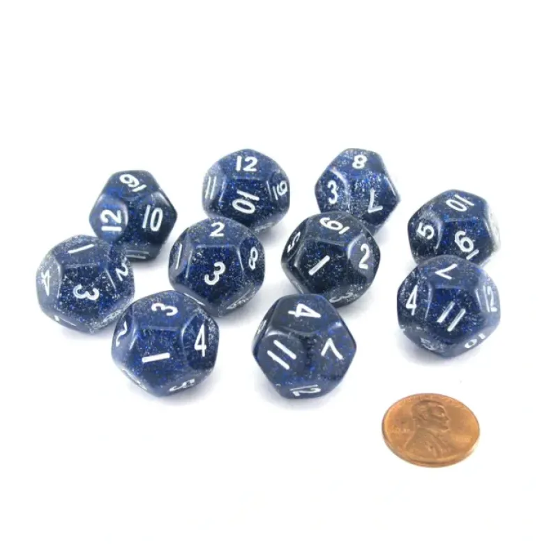These twelve sided 20mm glitter dice are numbered from one to twelve with numbers, not pips, and feel great in your hands. These glitter dice are sparkly, good quality, and great for any dice game! The 6 and 9 have decimals in the lower right corner of their respective sides to help differentiate the two numbers.
