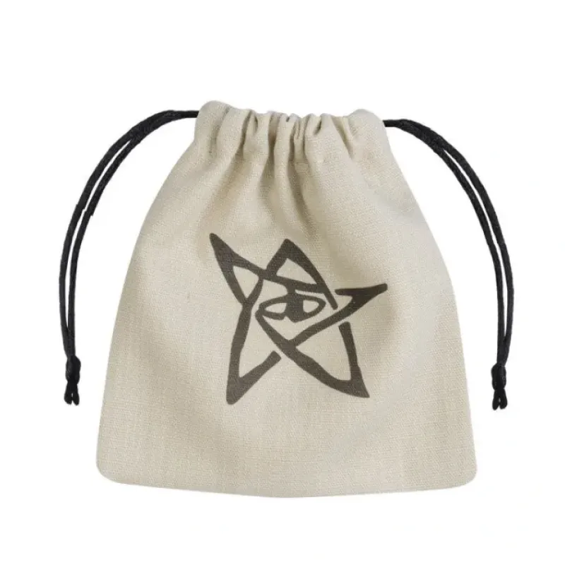This is classic color Cthulhu Dice Bag, made of thick beige fine cotton and adorned with noble black print. The Elder Sign on one side should bring protection for all your actions and rolls. This is a very safe bag because two strings hold firmly all that you put inside.