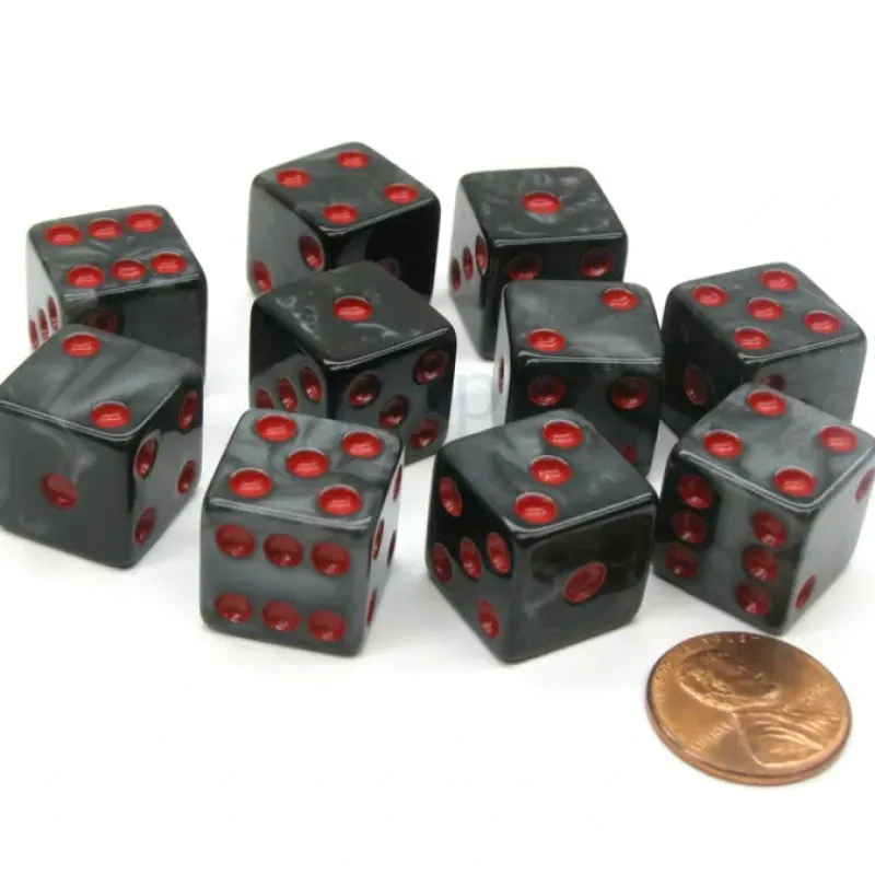 These 16mm Charcoal D6 ‘Marbleized’ dice are numbered 1 to 6 with red pips, spots, etched into the surface of the dice and painted. 16mm dice are often considered standard-sized dice. The 10 dice come enclosed in a convenient plastic re-sealable reusable bag. Great for educational games, dice games, board games, and friends and family fun!