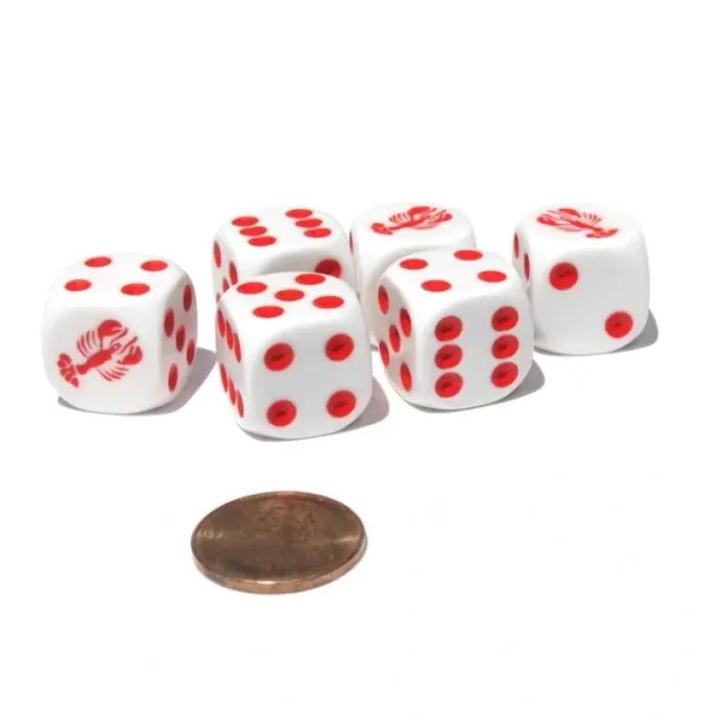 These 16mm lobster dice have nice, smooth rounded-edges that make for a great feel and roll. They are numbered 1 to 6 with traditional dice pips, spots, etched into the surface of the dice and painted red. A lobster is etched into the side where the 1 pip, the “ace,” would traditionally be located. Use these lobster dice to play your favorite dice and board games or create your own game. 6 dice enclosed in a convenient small plastic resealable bag are included with this purchase.