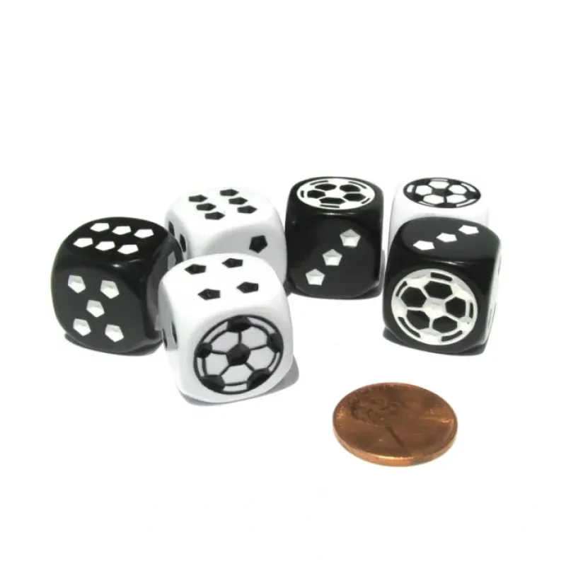 These 18mm soccer ball dice have nice, smooth rounded-edges that make for a great feel and roll. They are numbered 1 to 6 with traditional dice pips, spots, etched into the surface of the dice and painted black or white. A soccer ball is etched into the side where the 1 pip, the “ace,” would traditionally be located. Use these soccer ball dice to play your favorite dice and board games or create your own game. 6 dice – 3 white with black pips and 3 black with white pips – enclosed in a convenient small plastic resealable bag are included with this purchase.