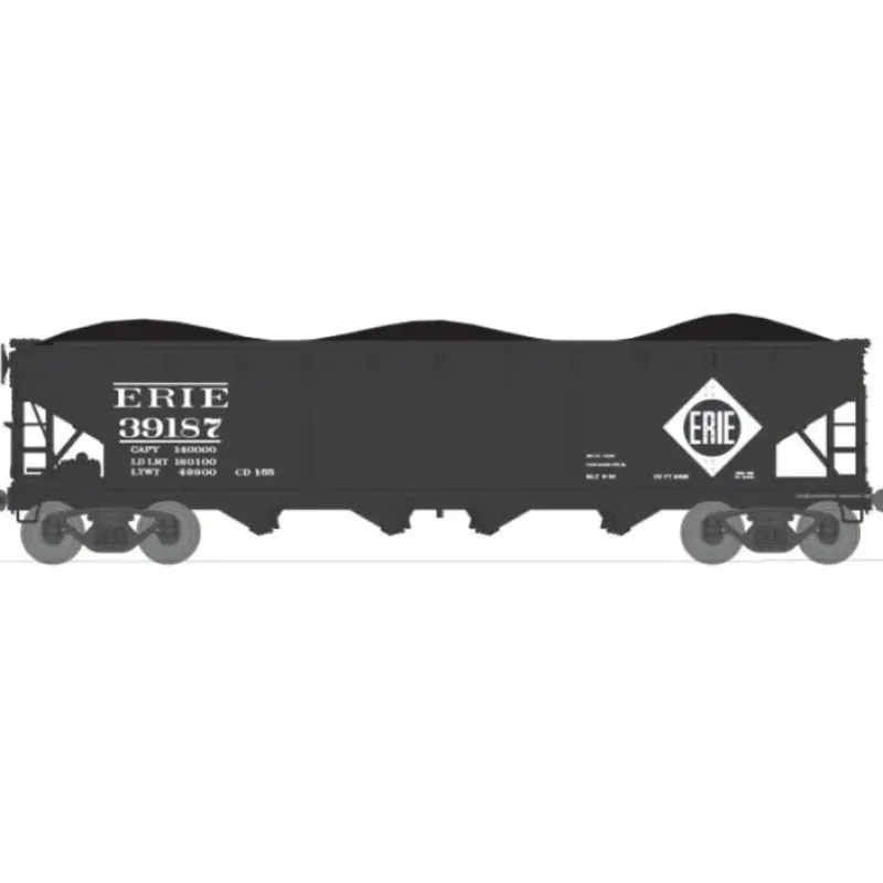 This is a Broadway Limited 3192 N Scale Erie ARA/AAR 70-Ton 4-Bay Hopper with Load 6-Pack – Ready to Run Set B (black, Large Diamond Logo).The ARA/AAR 70-ton Quad Hopper was a ubiquitous tool used by a variety of railroads. Primarily used for hauling coal loads, nearly 12,000 hoppers were built and delivered between 1926 and 1930. These handsomely crafted and highly detailed models are available in distinctly numbered 6-packs. This run Features A, B, and C (in some cases) packs – meaning if you purchase All three packs, you will have 18 distinctly numbered cars for a long string of coal haulers. Realistic removable coal loads and detailed bay interiors make for versatile use in any scenario. These quad hoppers will be built to order, so dont miss out. Preorder with your dealer today. Industry-Leading Features: Beautifully Detailed and Accurately Modeled, Precision Paint, Color, and Lettering Schemes, Many Separately Applied Details, Detailed Bay Interiors, Realistic Removable Coal Loads, Composition: ABS, Couplers: (2) Operating MicroTrains #1015 or Compatible, Compatible Tracks: Code 55, 70, 83, & 100 Rail, Minimum Operating Radius: 9.75 in.