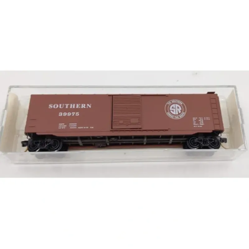 Here is a Brooklyn Locomotive Works BLW-32 N Southern 40′ Standard Boxcar #39975. This product features a plastic construction with plastic wheels and knuckle couplers.