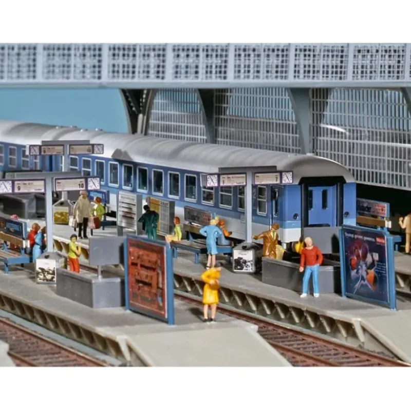 This is Faller 120186 Platform Accessories. The package contains various billboards, timetables, benches, waste baskets, clocks and train target indicators. To go with the covered platform 120199. This building kit contains: 54 single parts in 3 colours, 1 decoration and 1 construction instruction.
