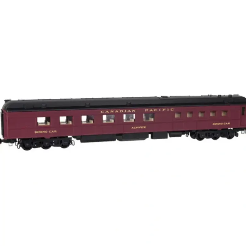 This is a Micro Trains Line 489-14600080 N Scale Heavyweight Diner – Ready to Run Canadian Pacific Alnwick (maroon, black). This car feature plastic construction, plastic couplers and plastic wheels.