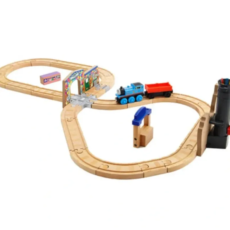 This is a Fisher Price CDK47 Thomas & Friends Wooden Railway 70th Anniversary Play Set. Features: Includes Thomas train engine, Destination pieces including the Sodor Novelty Store and the snack stand, Roll your engine past the ship to activate the fireworks feature and see multi-coloured streamers pop out of the ships smokestack!