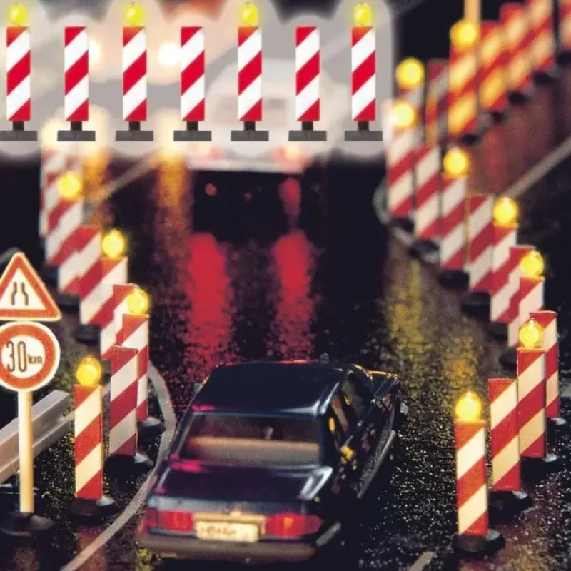 This is Busch 5907 Construction Blinkers with Controller. Construction site blinkers. Includes Includes seven stanchio barricades (four with blinking lights) and control unit. Each road cone is approximately 5/8 inch tall.
